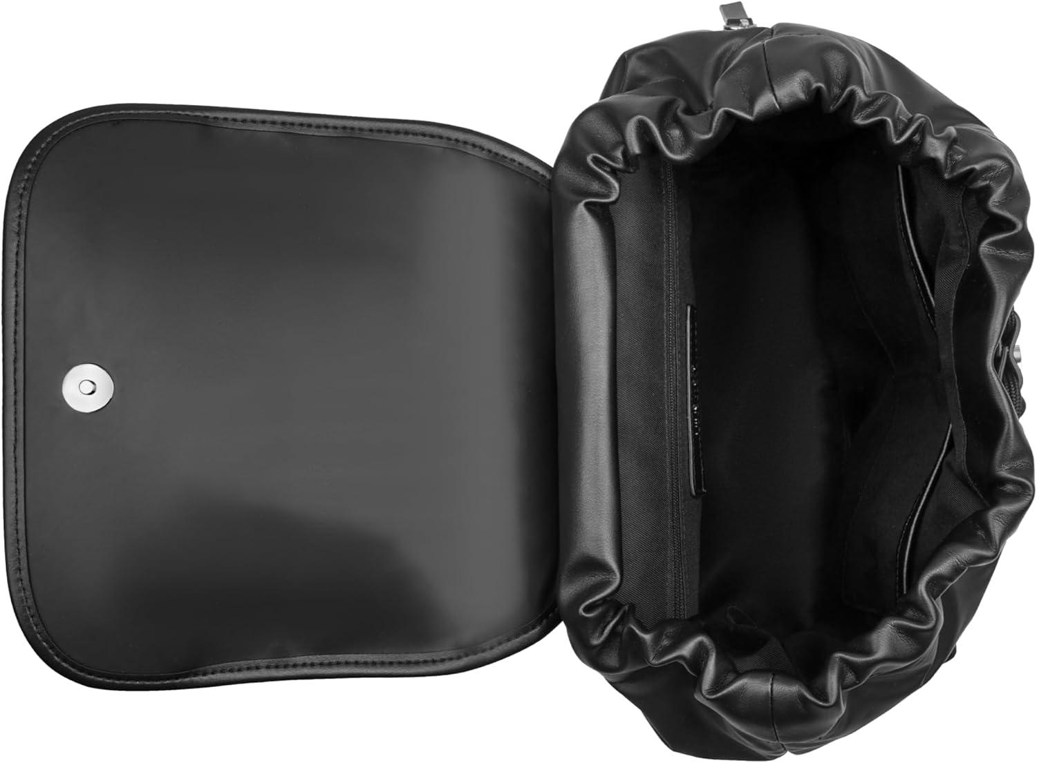 Nine West designer Jaren flap backpack with internal slip and zipper pocket organization and external hardware details and branding. Holds laptop and includes gusted front pocket and nylon material.
