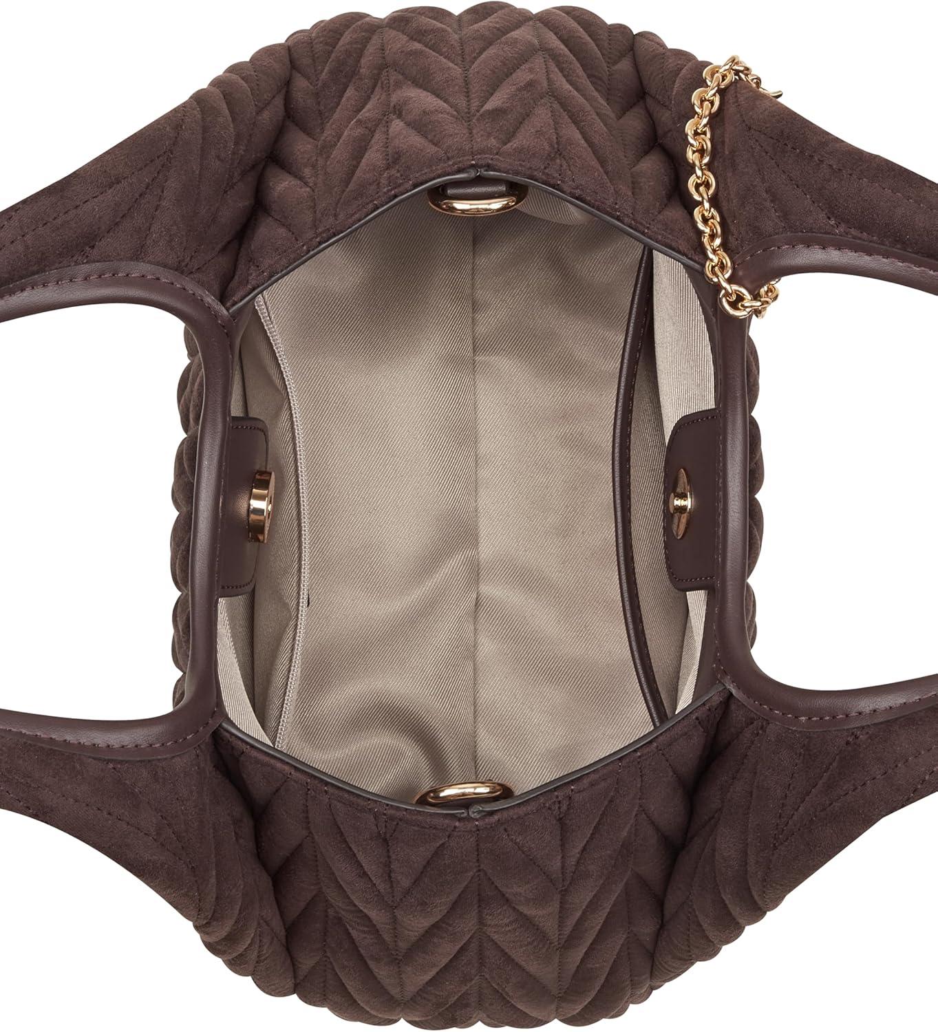 Nine West designer Jaslee top handle crossbody with internal slip and zipper pocket organization and external hardware details and branding. Designed in fashion faux suede quilt. Converts from handheld to crossbody.