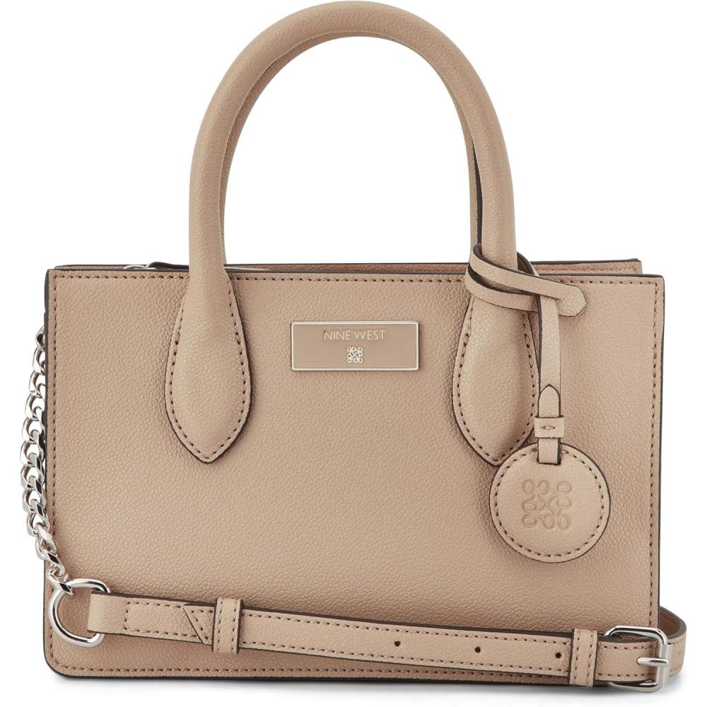 Nine West designer Magdalina mini tote crossbody with internal slip and zipper pocket organization and external hardware details and branding. Removable crossbody chain strap for hands free ease style or wear hand held.