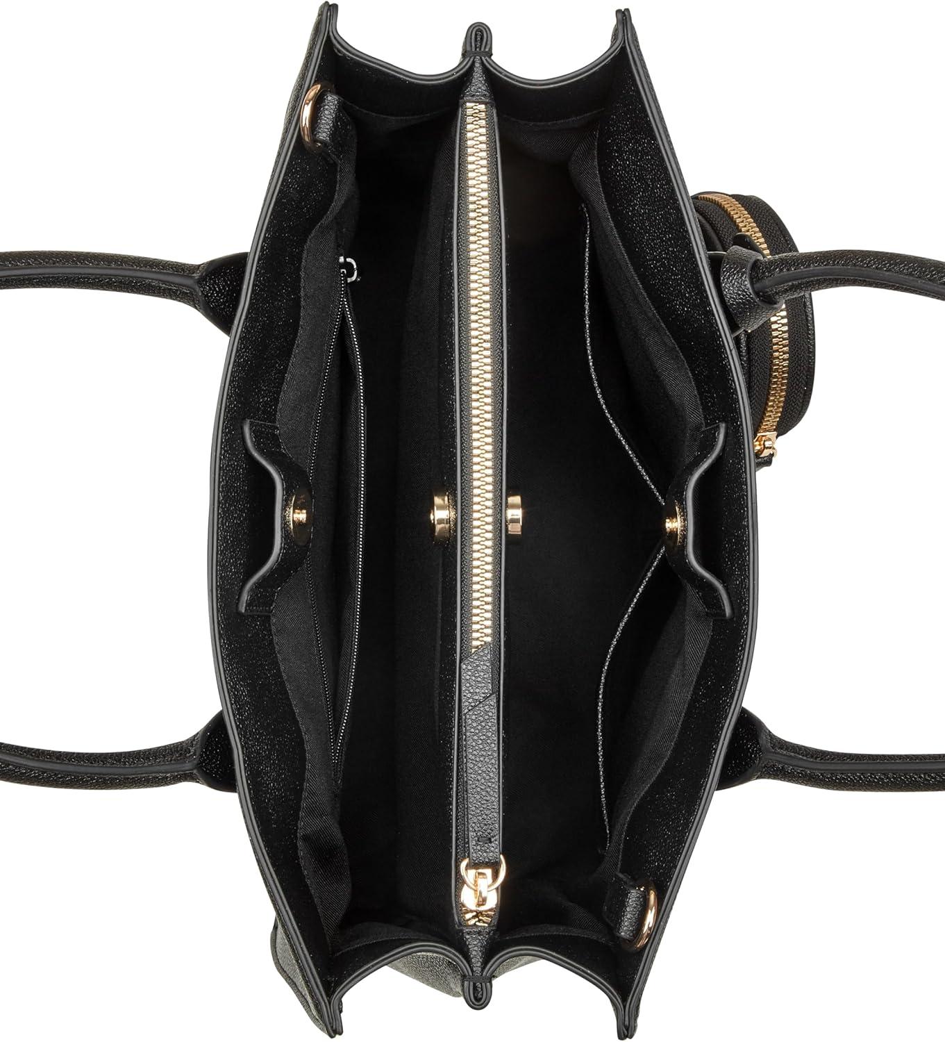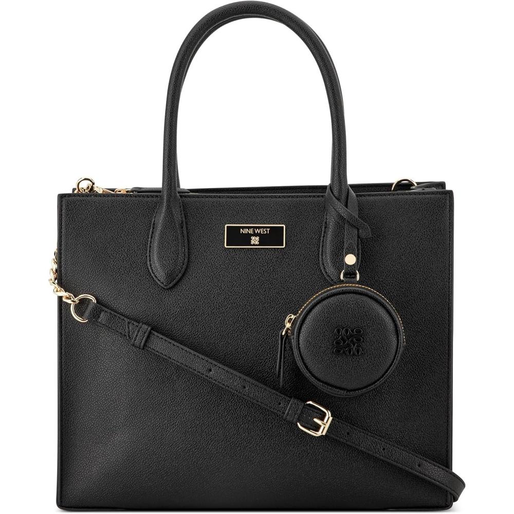 Nine West designer Magdalina triple compartment shopper with internal slip and zipper pocket organization and external hardware details and branding. Chain removable strap for hands free ease.