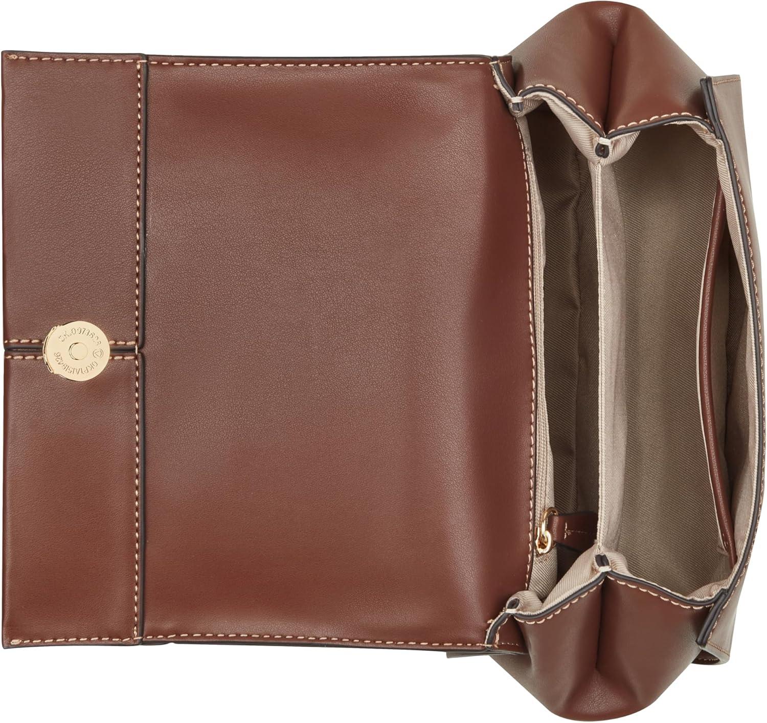 Nine West designer Paxtin convertible crossbody flap with internal slip and zipper pocket organization and external hardware details and branding. Paxtin group designed in leather like material and contrast strip details.