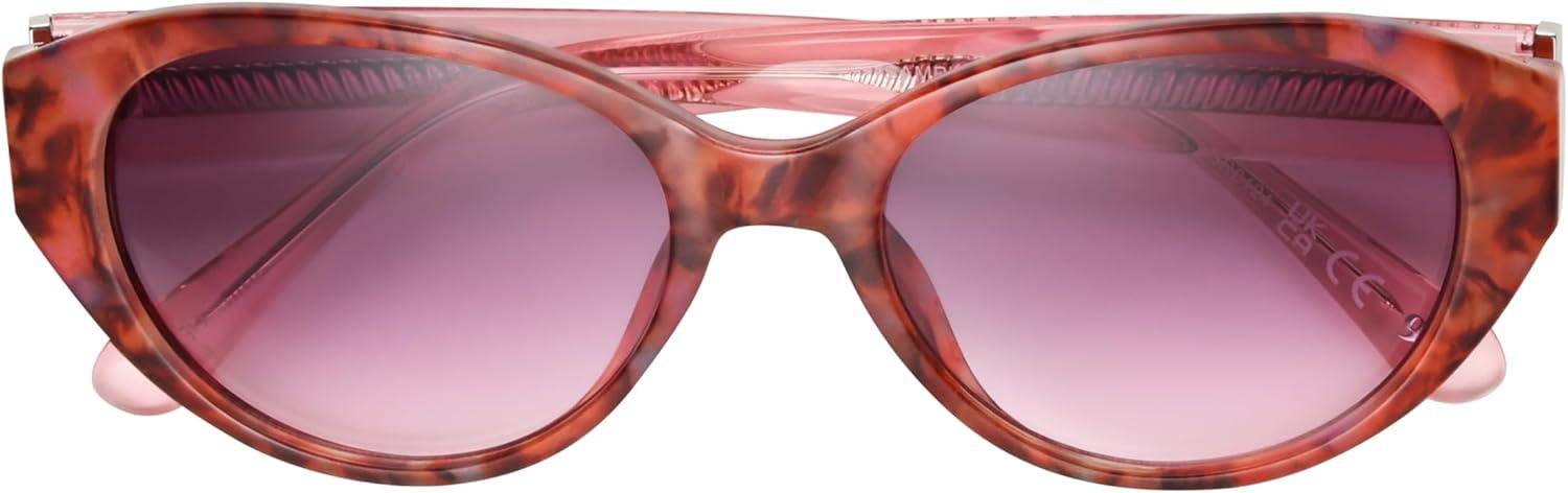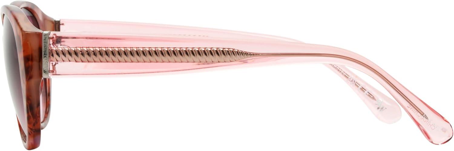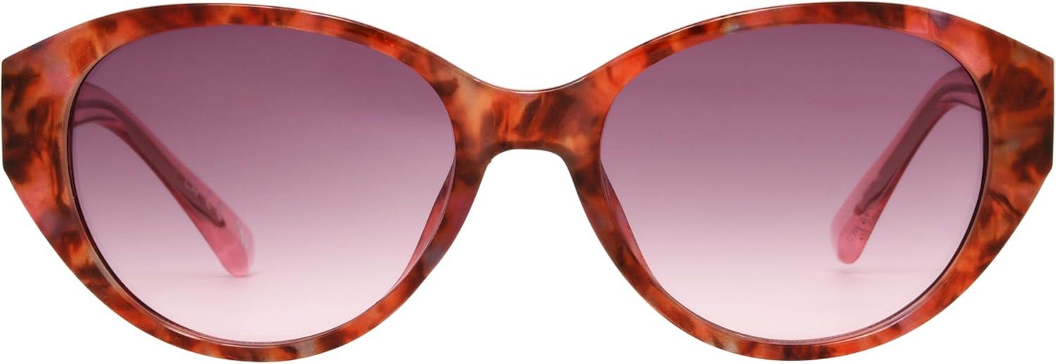 Embrace refined elegance with these Nine West Kalina women's sunglasses, featuring gracefully rounded oval frame fronts in a captivating multi-hued tortoise pattern. The temples are adorned in a soft pink tone with intricate detailing, adding a touch of sophistication to the design. The frame is made with 100% recycled plastic. The lenses are smoke-tinted, offering a stylish flair while ensuring scratch and impact resistance. With 100% UVA-UVB lens protection, these sunglasses seamlessly blend high-fashion allure with essential eye safety, perfect for the modern, discerning woman.