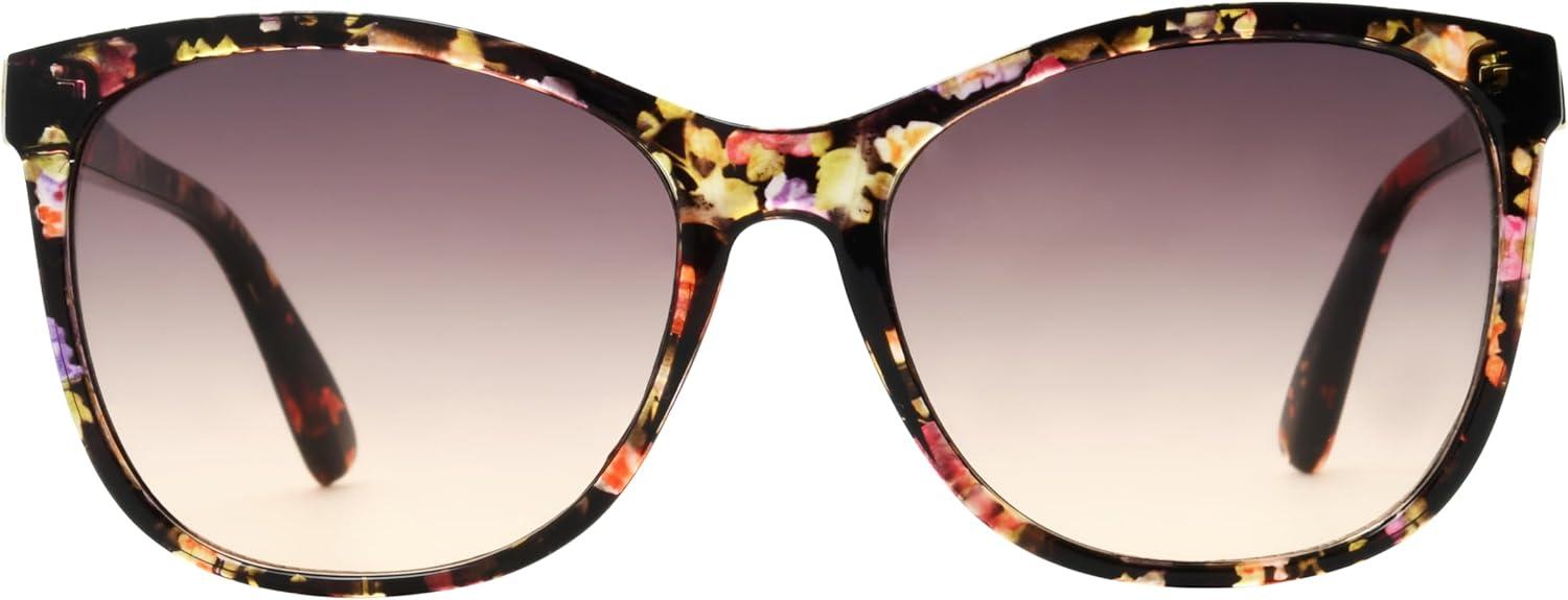 These hypnotizing Nine West Vika Women's Sunglasses feature a multi-colored tortoise print on gorgeous cat-eye frames. The lenses have a warm smoke gradient. The lenses offer 100% UVA-UVB protection from the sun's harmful rays and are scratch and impact-resistant.