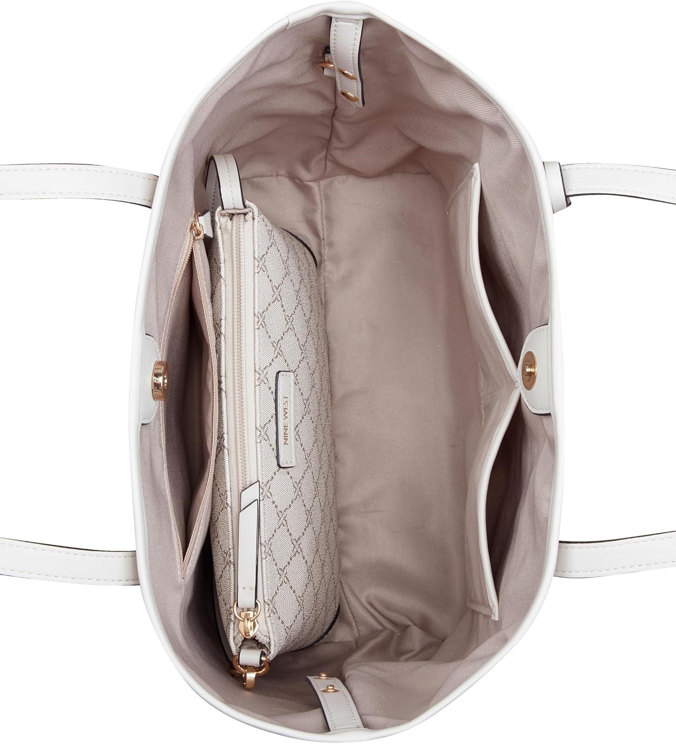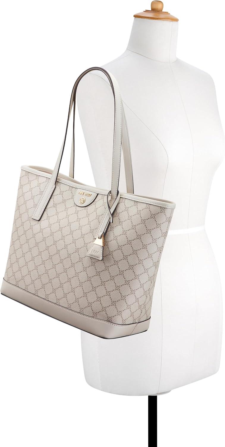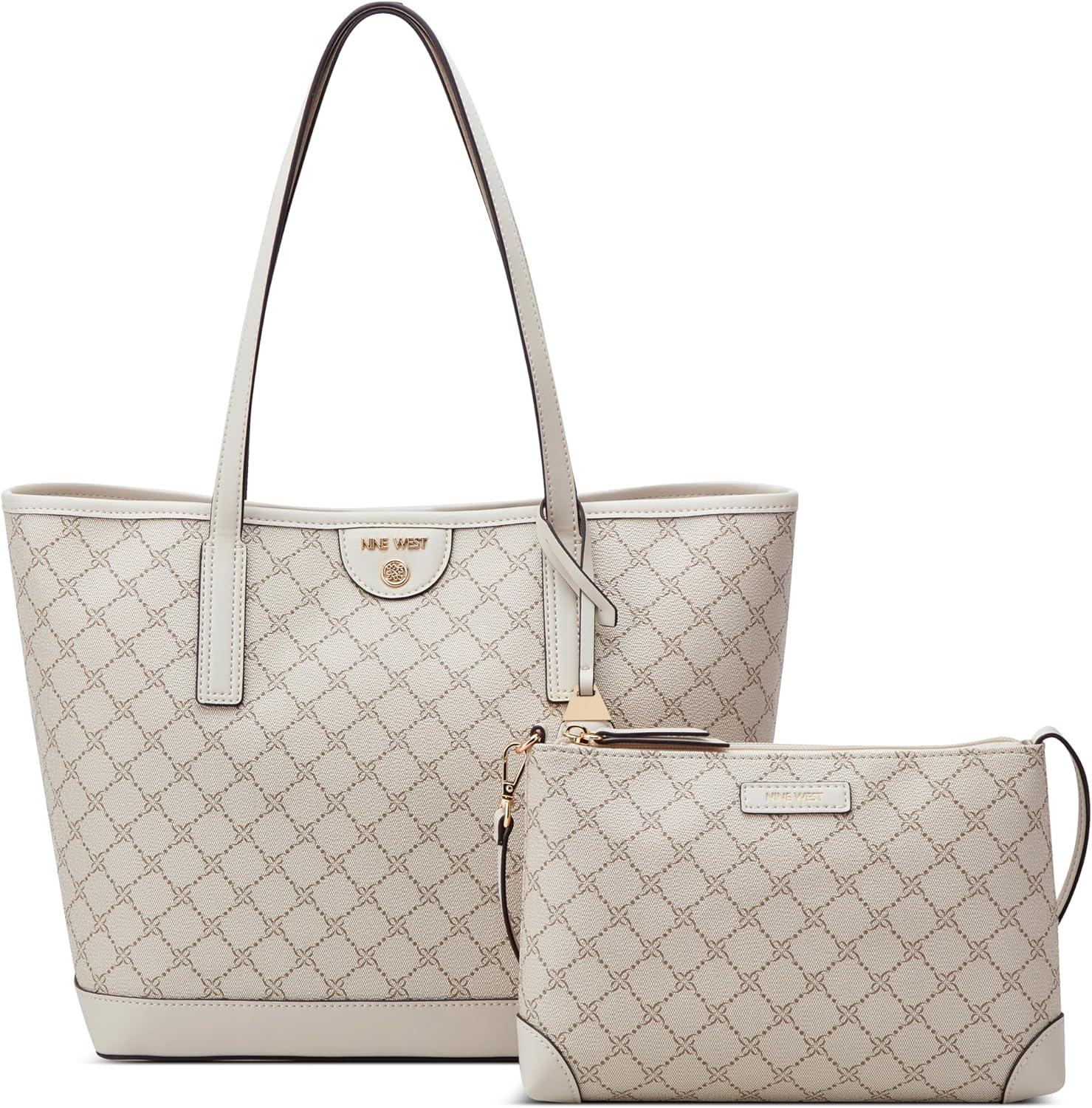 Nine West Designer Teagan 2 in 1 tote. Tote cinches with snap to create shoulder bag silhouette and also includes a short shoulder to utilize as a fun small bag include inside tote for essentials in your matching bag. Magnetic closure and interior organization pockets. Pin letter branding with lockup detail.